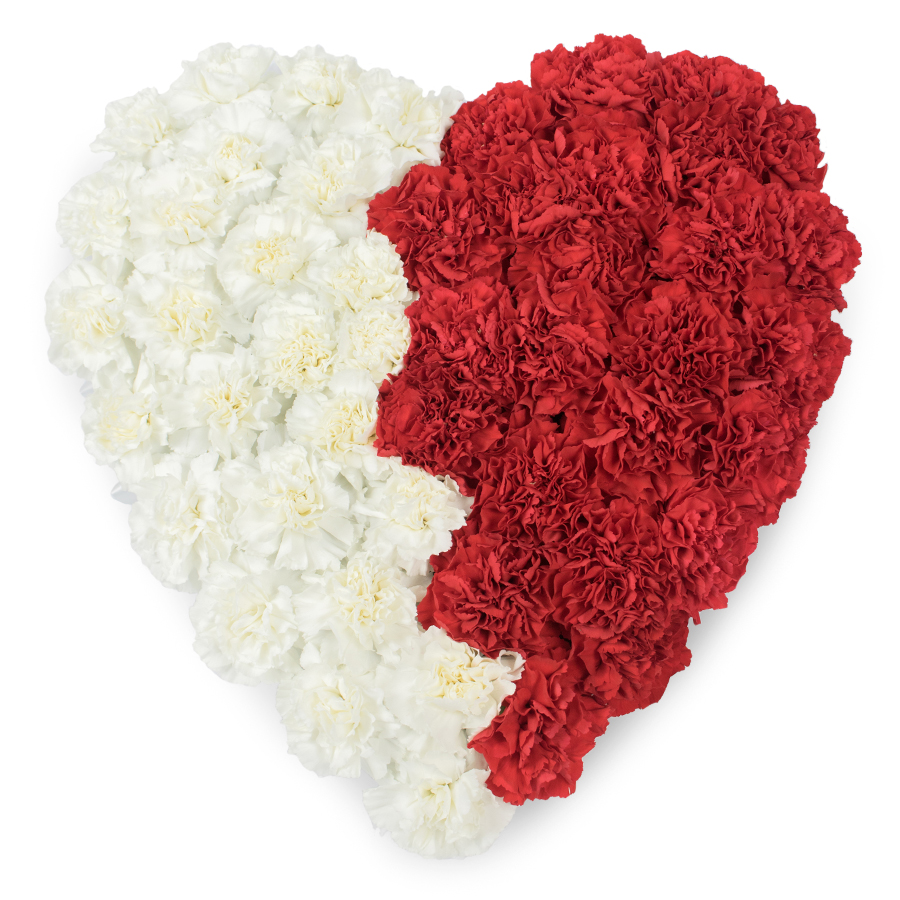 Celebrate love and sympathy with our stunning heart-shaped bouquet of mixed carnations. The exquisite combination of white and red carnations creates a visually captivating arrangement that stands out for its beauty and uniqueness.